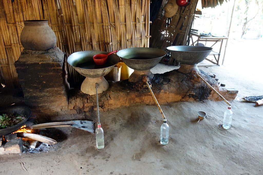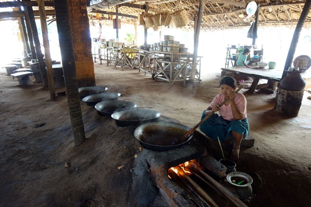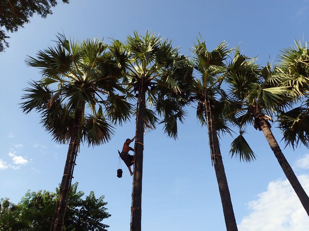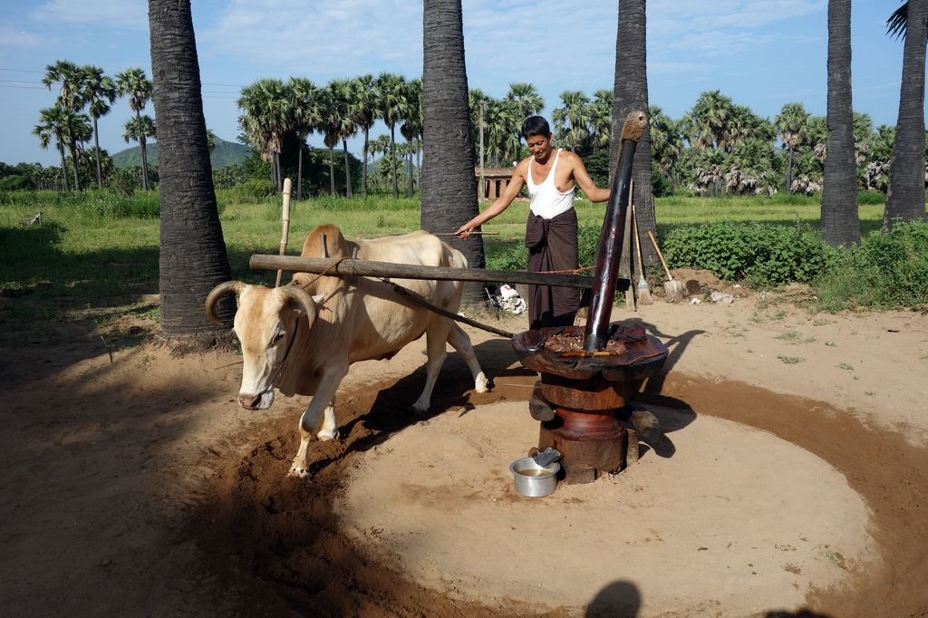 Shortly after starting in Bagan we visited a palm sugar manufacture where the production from the harvest of the syrup till the manufacture of palm sugar and liquor was presented to us.